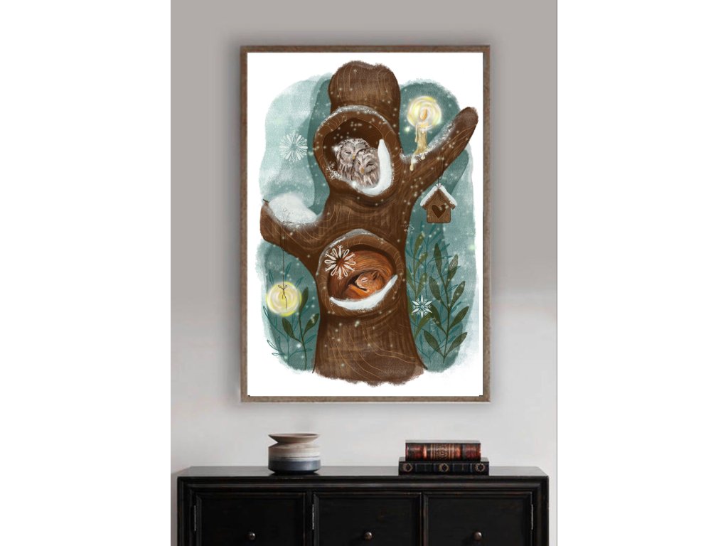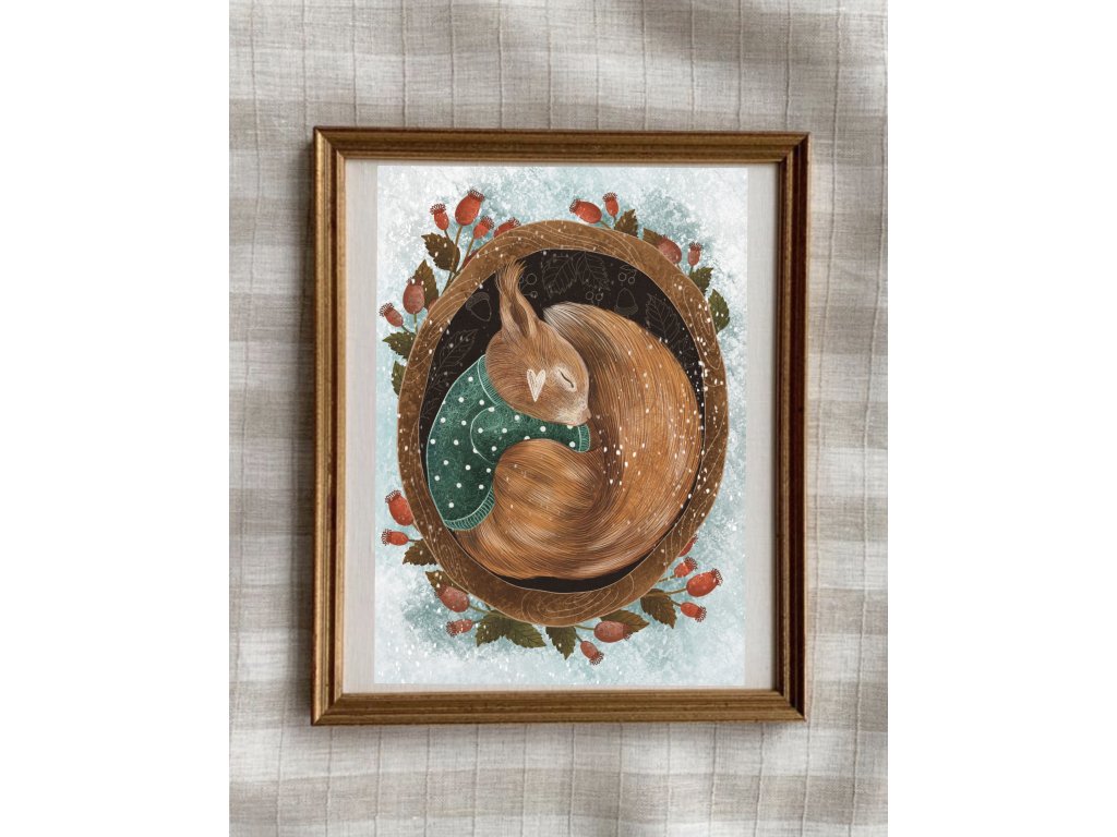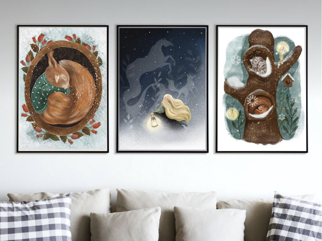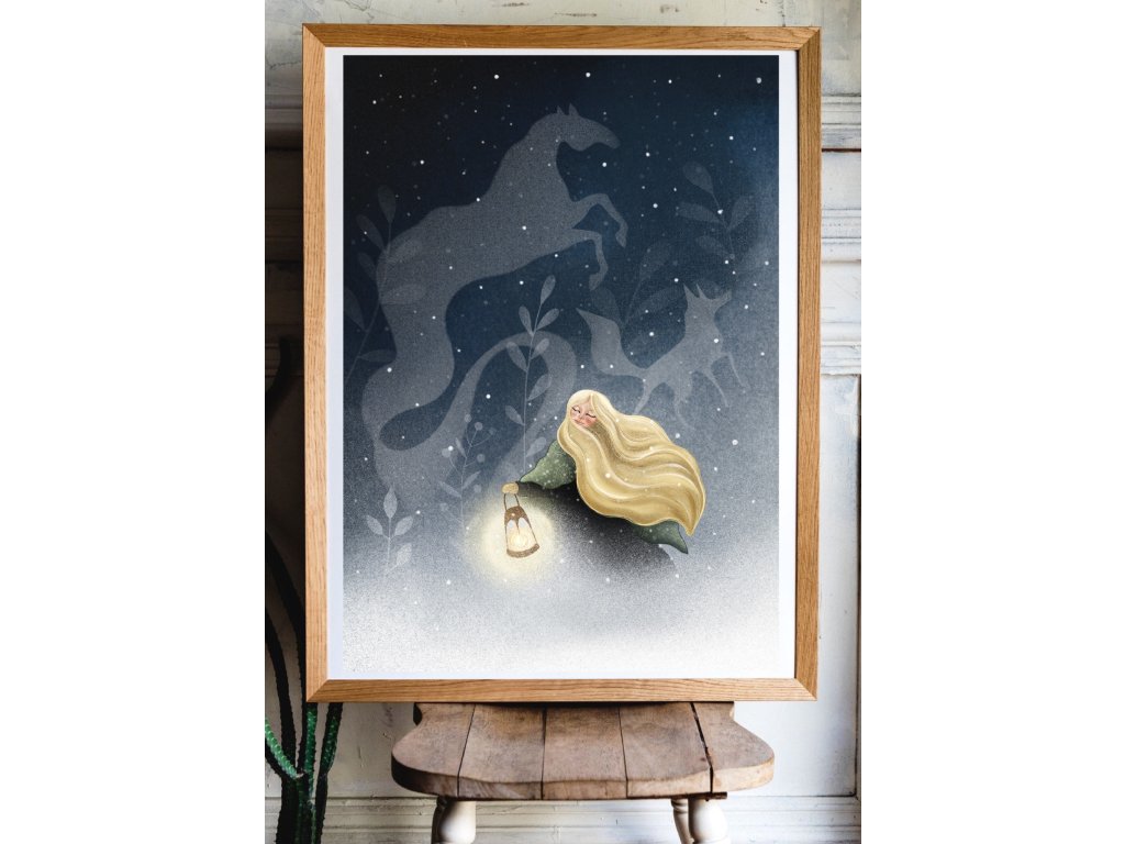 Chladivá tématika, krorá ale zahreje svojou krásou obsahuje print Ryšavé klbko - nech vám pripomenie, že zima je čas oddychu. Z úplne novej kolekcie je to ilustrácia Snežné kone plná tajomna, snehu, nádeje, tmy no zároveň svetla. Ako posledný print v balíčku nájdete Celú zimu prespím - veľmi obľúbený motív nielen deťmi :)